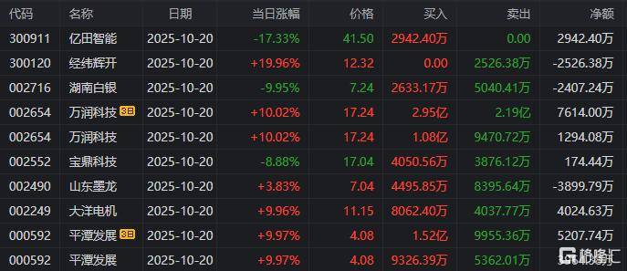 龙虎榜中涉及机构专用席位的个股中,当日净卖出额前三为赤峰黄金、湖南白银、宝鼎科技,分别为2.5亿元、5570.68万元、3900.12万元。