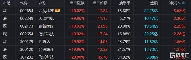 龙虎榜单日净买入额前三为大洋电机、创新医疗、万润科技,分别为2.3亿元、2.29亿元、2.28亿元。