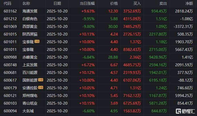 龙虎榜单日净卖出额前三为白银有色、赤峰黄金、山东墨龙,分别为3.39亿元、1.32亿元、1.15亿元。