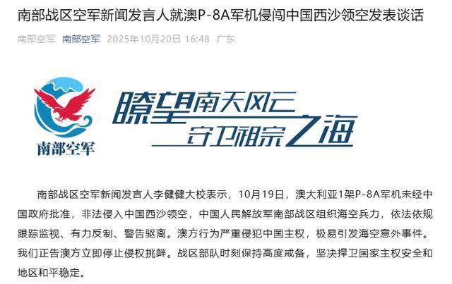 南部战区空军新闻发言人李健健大校表示,10月19日,澳大利亚1架P-8A军机未经中国政府批准,非法侵入中国西沙领空,中国人民解放军南部战区组织海空兵力,依法依规跟踪监视、有力反制、警告驱离。澳方行为严重侵犯中国主权,极易引发海空意外事件。我们正告澳方立即停止侵权挑衅。战区部队时刻保持高度戒备,坚决捍卫国家主权安全和地区和平稳定。