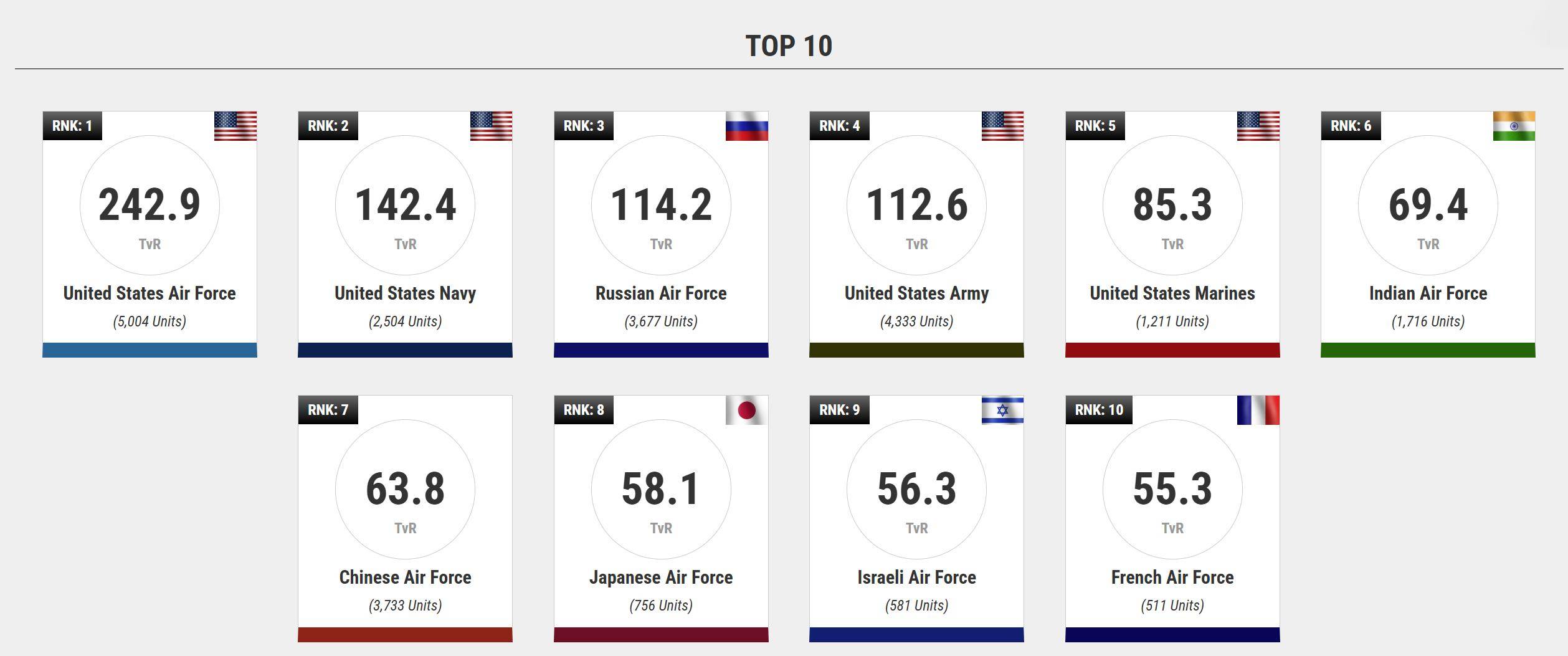 这个TVR数值高低,不仅考虑飞机数量,还要考虑攻击与防御力、后勤支持、现代化和作战训练等因素。也就是说,所谓“排名”只是一个指数总和的排名,并不能直接代替实力如何,更不代表实际战斗力的差距。