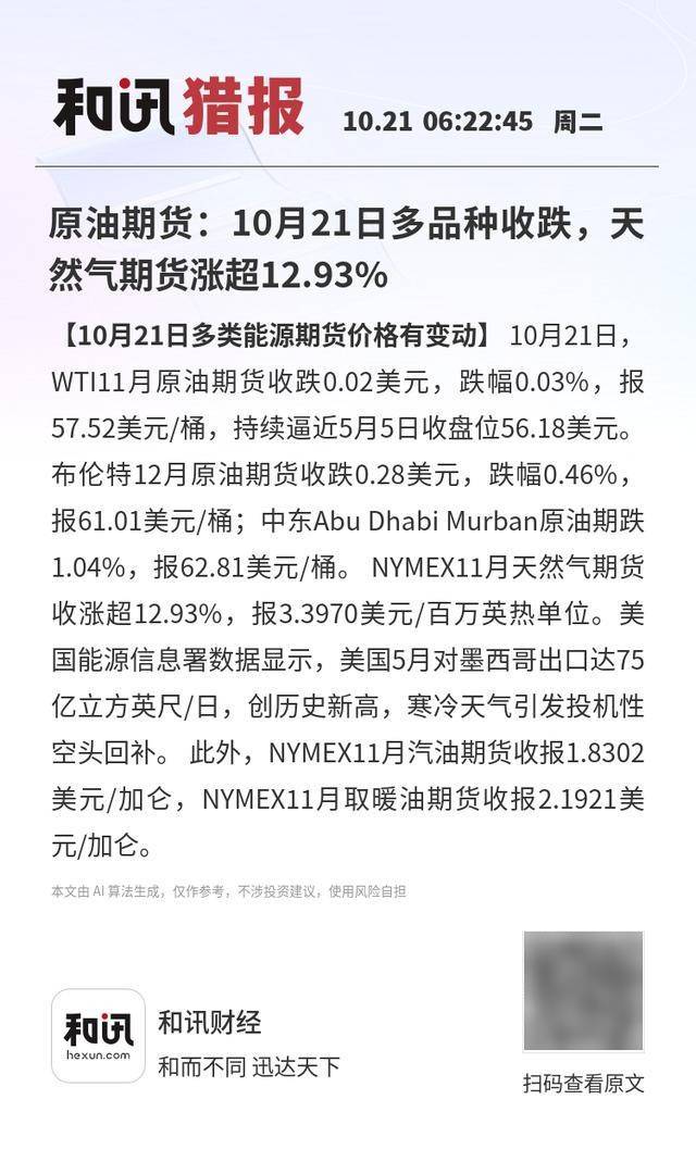 【10月21日多类能源期货价格有变动】10月21日,WTI11月原油期货收跌0.02美元,跌幅0.03%,报57.52美元/桶,持续逼近5月5日收盘位56.18美元。 布伦特12月原油期货收跌0.28美元,跌幅0.46%,报61.01美元/桶;中东Abu Dhabi Murban原油期跌1.04%,报62.81美元/桶。 NYMEX11月天然气期货收涨超12.93%,报3.3970美元/百万英热单位。美国能源信息署数据显示,美国5月对墨西哥出口达75亿立方英尺/日,创历史新高,寒冷天气引发投机性空头回补。 此外,NYMEX11月汽油期货收报1.8302美元/加仑,NYMEX11月取暖油期货收报2.1921美元/加仑。