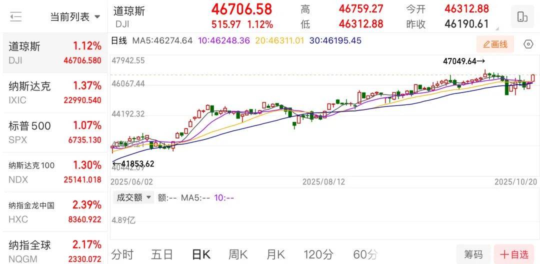 当地时间10月20日,美股三大指数集体上涨。截至收盘,道琼斯工业平均指数涨515.97点,涨幅1.12%,报46706.58点;纳斯达克指数涨310.57点,涨幅1.37%,报22990.54点;标普500指数收涨71.12点,涨幅1.07%,报6735.13点。