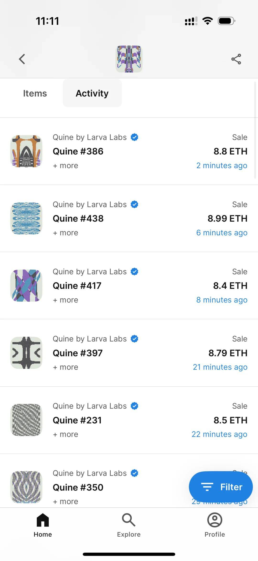 我买的生成艺术作品,是一个NFT。系列名叫《Quine by Larva Labs》。