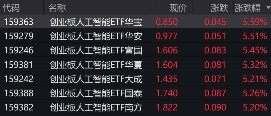 受盘面影响,创业板人工智能相关ETF涨约5%。