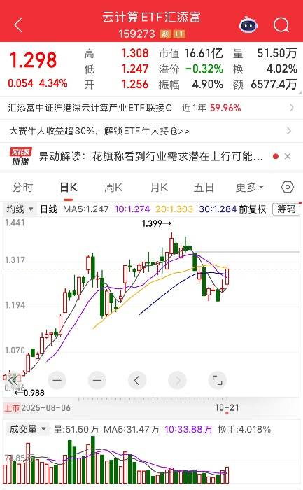 流动性方面,云计算ETF汇添富盘中换手4.02%,成交6577.4万元。拉长时间看,截至10月20日,云计算ETF汇添富近1年日均成交7774.05万元,居可比基金第一。
