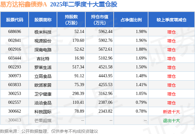 根据2025基金半年报公募基金重仓股数据,重仓该股的公募基金共25家,其中持有数量最多的公募基金为易方达基金的易方达裕鑫债券A。易方达裕鑫债券A目前规模为20.34亿元,最新净值1.6981(10月20日),较上一交易日下跌0.08%,近一年上涨21.33%。该公募基金现任基金经理为胡文伯。胡文伯在任的基金产品包括:易方达鑫转招利混合A,管理时间为2023年3月16日至今,期间收益率为16.22%;易方达磐固六个月持有期混合A,管理时间为2023年6月21日至今,期间收益率为6.22%。