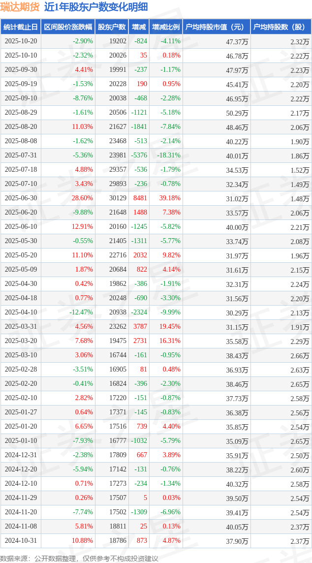 证券之星消息,近日瑞达期货披露,截至2025年10月20日公司股东户数为1.92万户,较10月10日减少824.0户,减幅为4.11%。户均持股数量由上期的2.22万股增加至2.32万股,户均持股市值为47.37万元。
