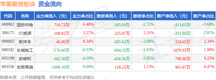从资金流向上来看,当日苹果期货板块主力资金净流出754.5万元,游资资金净流出1648.89万元,散户资金净流入2403.38万元。苹果期货板块个股资金流向见下表: