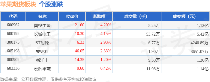 证券之星消息,10月21日苹果期货板块较上一交易日上涨2.13%,国投中鲁领涨。当日上证指数报收于3916.33,上涨1.36%。深证成指报收于13077.32,上涨2.06%。苹果期货板块个股涨跌见下表:
