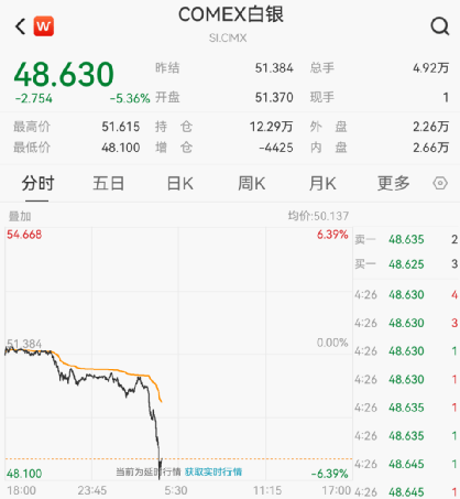 COMEX白银期货失守49美元/盎司,日内跌5.36%