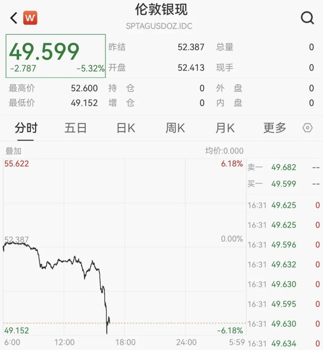 现货白银跌破50美元/盎司,为1010日以来首次,日内跌幅达5.32%