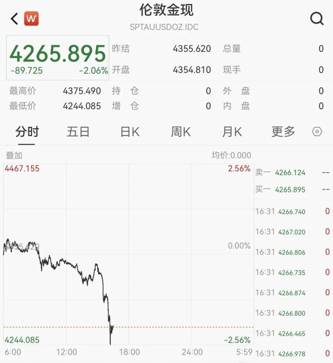 现货黄金一度失守4250美元/盎司,截至发稿时跌2.06%COMEX黄金期货价格短线下挫,现跌2.02%