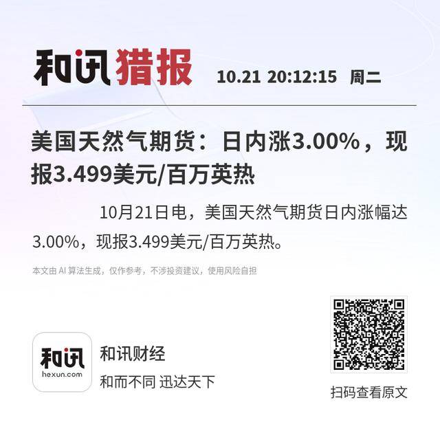 10月21日电,美国天然气期货日内涨幅达3.00%,现报3.499美元/百万英热。
