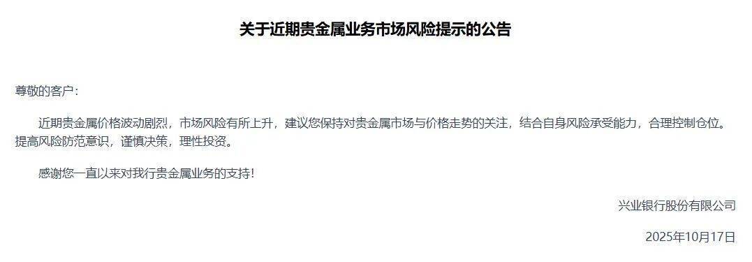 除了光大银行之外,兴业银行、招商银行、建设银行等多家银行,也对近期贵金属业务市场风险发出明确的提示。