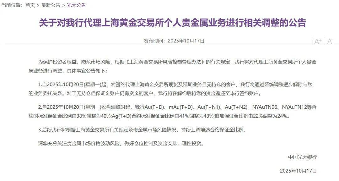 近日,光大银行发文称,自10月20日(星期一)起,对签约代理上海黄金交易所现货及延期业务且无持仓的客户,该行将通过系统调整逐步解除业务委托关系。同时,光大银行还将调整合约保证金。