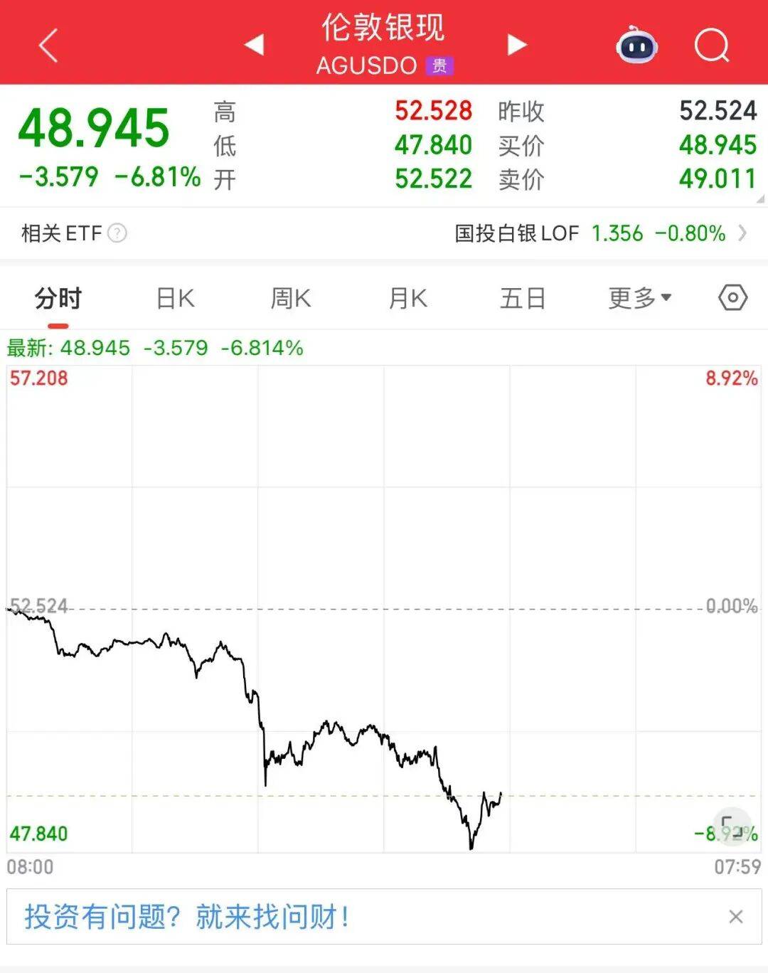 期货市场同样下挫。截至发稿,COMEX黄金跌5.01%,报4141.1美元/盎司;COMEX白银跌近7%,现报47.845美元/盎司。