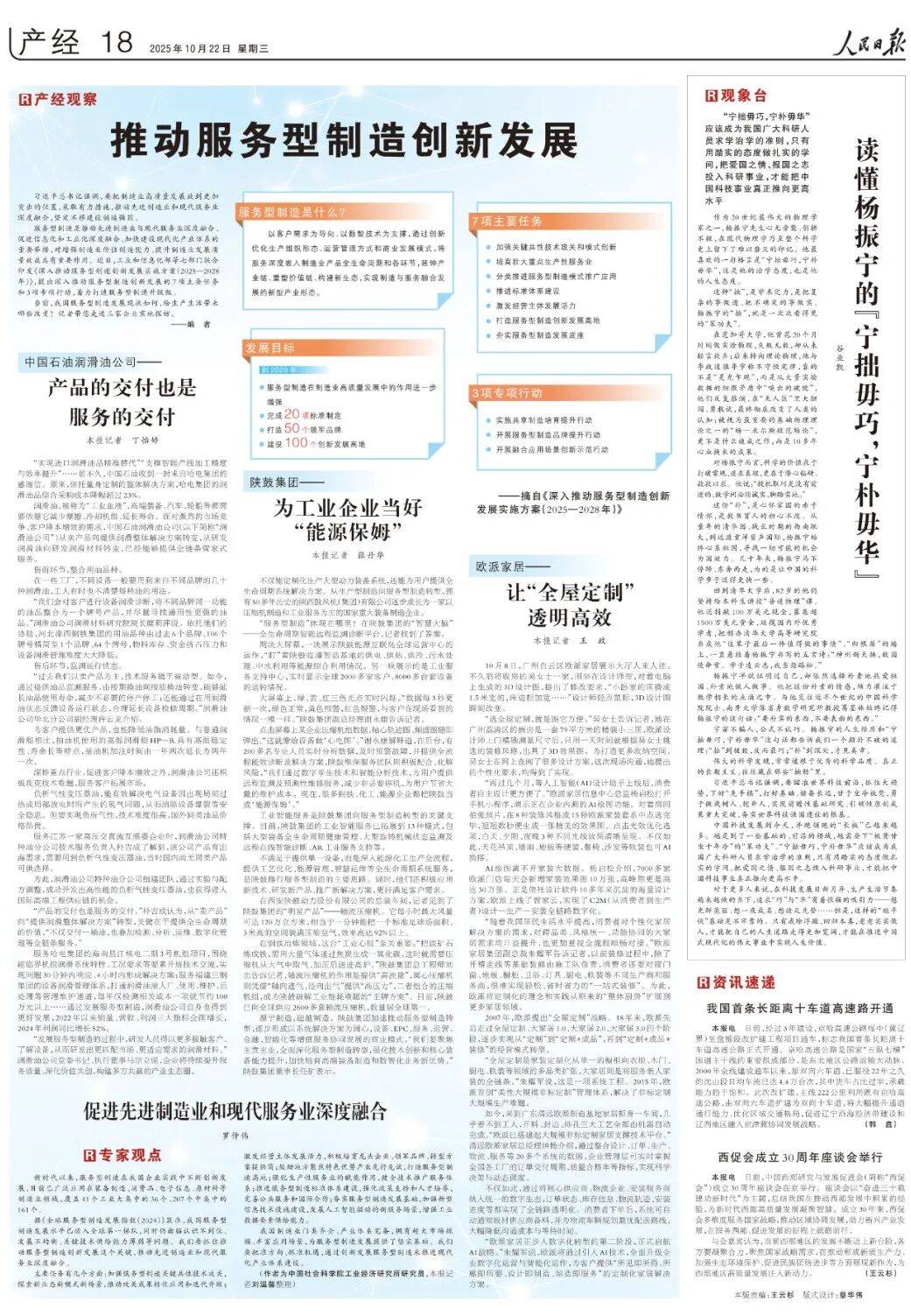 2025年10月22日,《人民日报》18版“产经观察”专栏以《推动服务型制造创新发展》为题,通过呈现实地探访三家企业案例,展现我国服务型制造转型给生产生活带来的新变化。作为该专题报道的实践案例之一,欧派家居在数字化转型与服务型智造领域的创新探索获呈现。