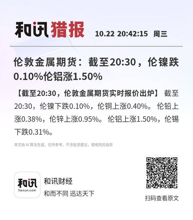 【截至20:30,伦敦金属期货实时报价出炉】截至20:30,伦镍下跌0.10%,伦铜上涨0.40%。 伦铅上涨0.38%,伦锌上涨0.95%。 伦铝上涨1.50%,伦锡下跌0.31%。