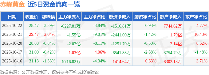 证券之星消息,截至2025年10月22日收盘,赤峰黄金(600988)报收于28.47元,下跌3.39%,换手率3.49%,成交量58.05万手,成交额16.22亿元。