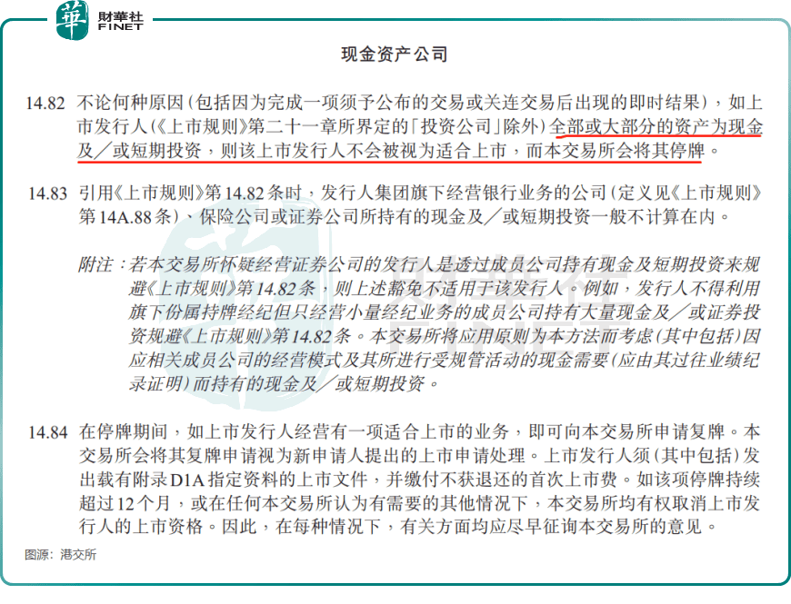 根据《上市规则》中的“现金资产公司”条款,如果上市发行人全部或大部分的资产为现金或短期投资,则该上市发行人不会被视为适合上市,而港交所会将其停牌。在停牌期间,如上市发行人经营有一项合适上市的业务,即可向港交所申请复牌。如果该项停牌持续超过12个月,港交所有权取消上市发行人的上市资格。