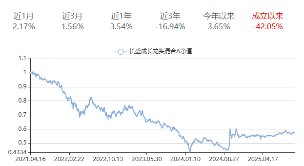 截至2025年10月21日,长盛成长龙头混合A年内净值上涨3.65%,跑输业绩比较基准逾27个百分点。成立4年多,该基金净值累计下跌42.05%。