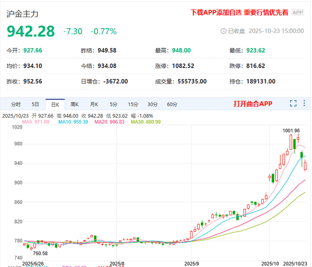 日内收盘,沪金下跌0.77%,报收942.28元/克。
