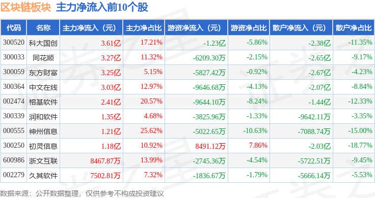 从资金流向上来看,当日区块链板块主力资金净流出17.68亿元,游资资金净流出5918.41万元,散户资金净流入18.28亿元。区块链板块个股资金流向见下表: