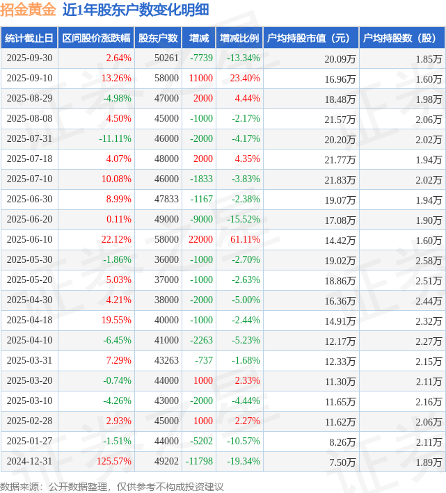 从股价来看,2025年9月10日至2025年9月30日,招金黄金区间涨幅为2.64%,在此期间股东户数减少7739.0户,减幅为13.34%。