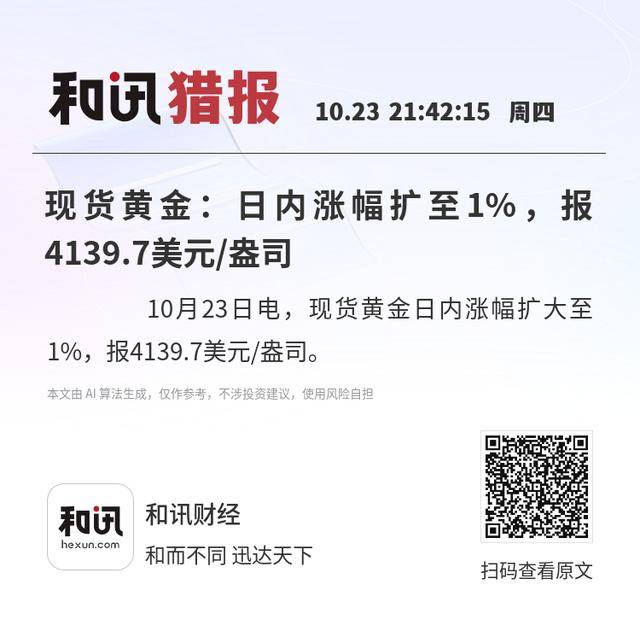 10月23日电,现货黄金日内涨幅扩大至1%,报4139.7美元/盎司。