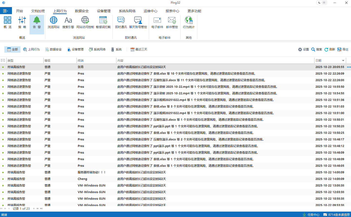代码操作审计与风险告警:完整记录代码创建、编辑、传输、删除等操作日志,包含操作人、终端设备、时间和代码流向。检测到批量下载代码、跨项目拷贝核心算法等异常行为时,立即弹窗或邮件告警,助力快速定位风险,及时阻断代码泄密。