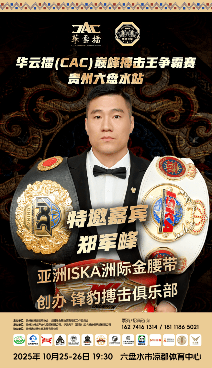 北京时间20251025日至26日,贵州六盘水市凉都体育中心,华云擂(CAC)巅峰搏击王争霸赛即将在凉都六盘水热血开战。本次比赛中外格斗高手云集,特邀嘉宾阵容星光熠熠。