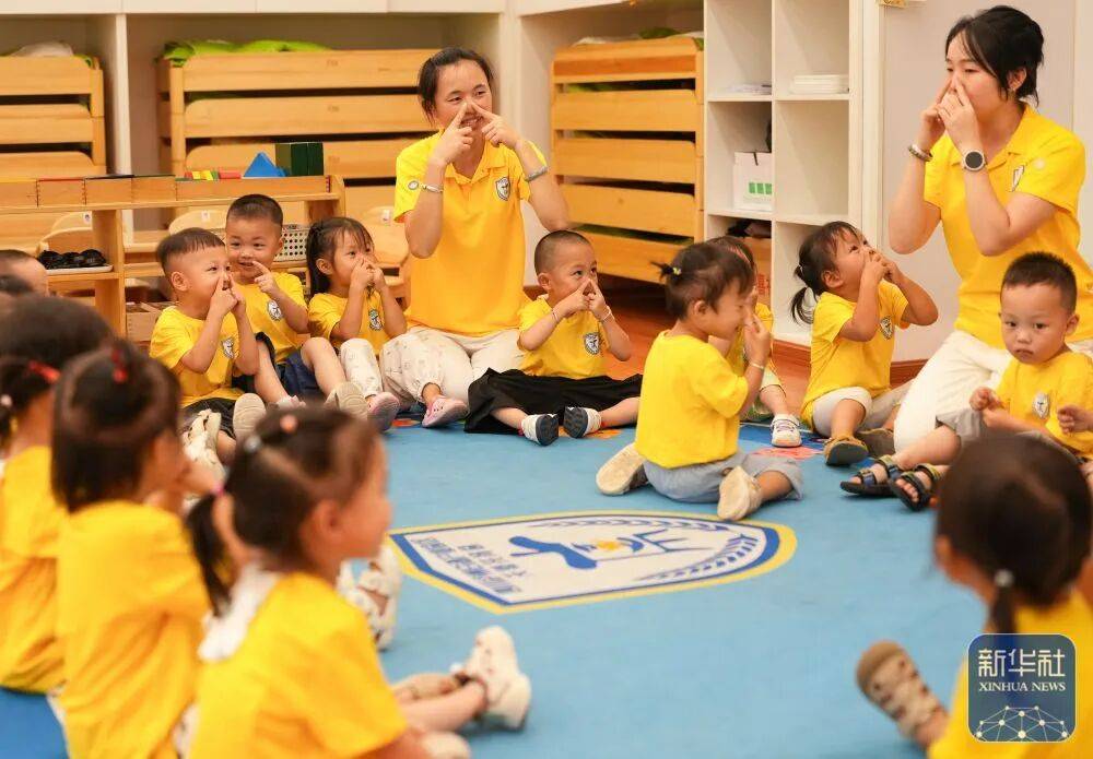 ▲9月5日,四川泸州白酒产业园区天骄托育园的老师带领孩子们做游戏。图/新华社