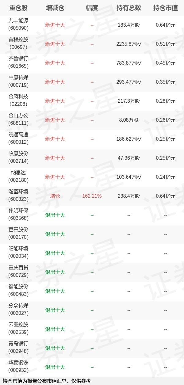 证券之星消息,10月28日中欧基金旗下刘勇 胡阗洋管理的中欧颐利债券型基金公布三季报,近1年净值增长率6.25%。与上一季度相比,该基金前十大重仓股新增九丰能源,首程控股,齐鲁银行,中原传媒,金风科技,金山办公,皖通高速,牧原股份,纳思达;并对瀚蓝环境增仓147.48万股,为该基金第一大重仓股;伟明环保,芭田股份,旺能环境,重庆百货,福能股份,分众传媒,云图控股,青岛银行,华菱钢铁等退出前十大重仓股;详细数据如下: