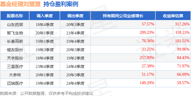 刘盟盟管理的天弘医疗健康混合A基金在19年3季度买入健友股份,在持有1年又0个季度后在20年3季度卖出。持有期间的估算收益率为99.96%,持有期间健友股份在2019年到2020年的年报归属净利润增幅达33.25%。