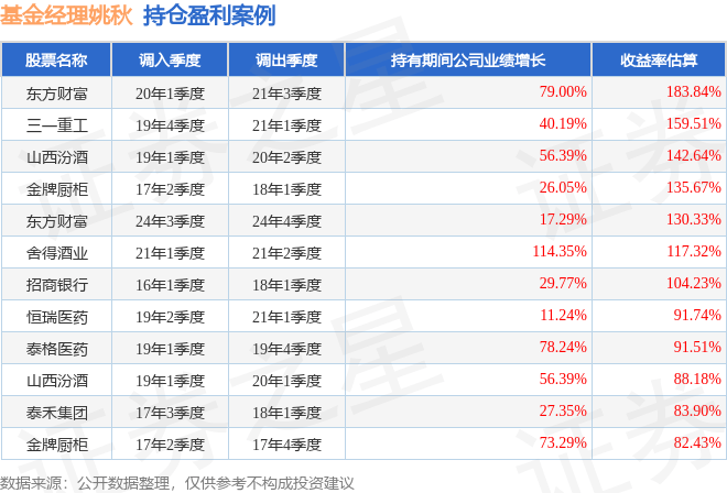 姚秋管理的新华增盈回报债券基金在20年1季度买入东方财富,在持有1年又2个季度后在21年3季度卖出。持有期间的估算收益率为183.84%,持有期间东方财富在2020年到2021年的年报归属净利润增幅达79%。