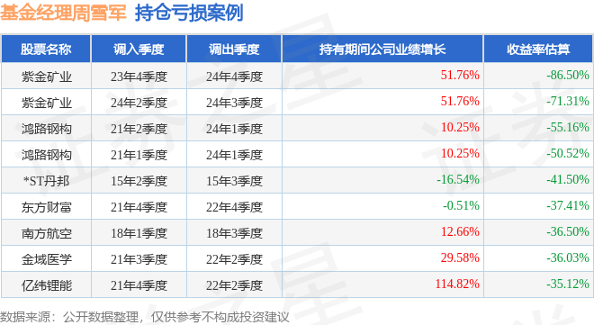 周雪军管理的海富通改革驱动混合基金在23年4季度买入紫金矿业,在持有1年又0个季度后在24年4季度卖出。持有期间的估算收益率为-86.5%,持有期间紫金矿业在2023年到2024年的年报归属净利润增幅达51.76%。