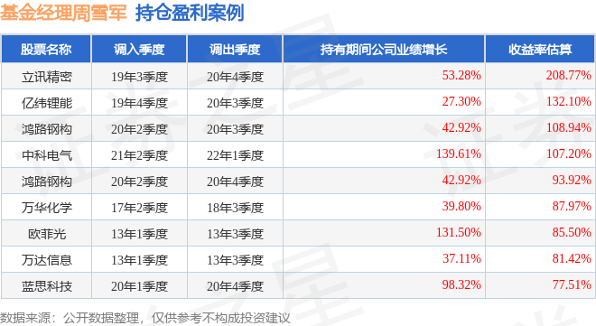 周雪军管理的海富通收益增长混合基金在19年3季度买入立讯精密,在持有1年又1个季度后在20年4季度卖出。持有期间的估算收益率为208.77%,持有期间立讯精密在2019年到2020年的年报归属净利润增幅达53.28%。