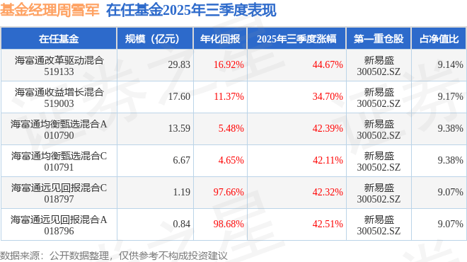 证券之星消息,截止2025年三季度末,基金经理周雪军旗下共管理6只基金,本季度表现最佳的为海富通改革驱动混合(519133),季度净值涨44.67%。