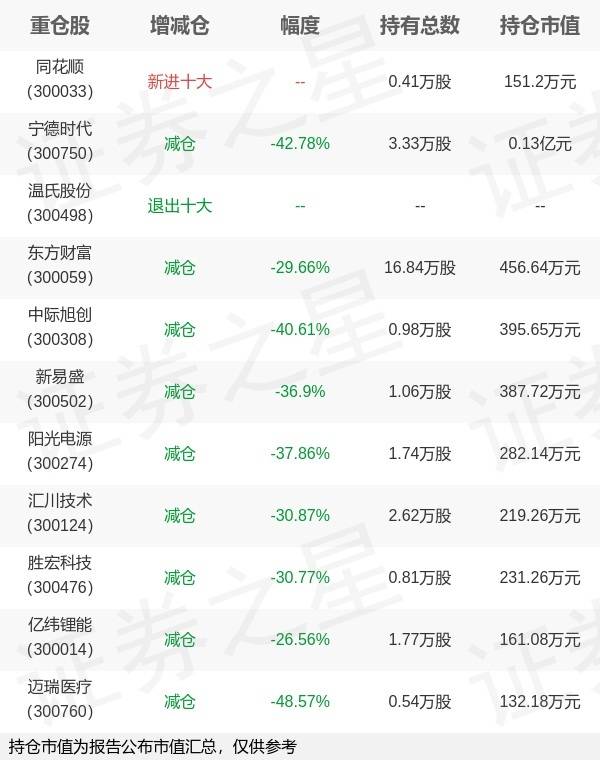 证券之星消息,10月28日天弘基金旗下林心龙 洪明华管理的天弘创业板交易型开放式指数基金联接基金公布三季报,近1年净值增长率43.05%。与上一季度相比,该基金前十大重仓股新增同花顺;其中宁德时代持仓占比0.17%,为该基金第一大重仓股;温氏股份等退出前十大重仓股;详细数据如下: