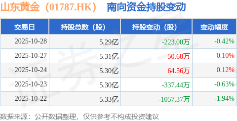 证券之星消息,10月28日南向资金减持223.0万股山东黄金(01787.HK)。近5个交易日中,获南向资金减持的有3天,累计净减持1502.57万股。近20个交易日中,获南向资金增持的有12天,累计净增持293.2万股。截至目前,南向资金持有山东黄金(01787.HK)5.29亿股,占公司已发行普通股的53.1%。