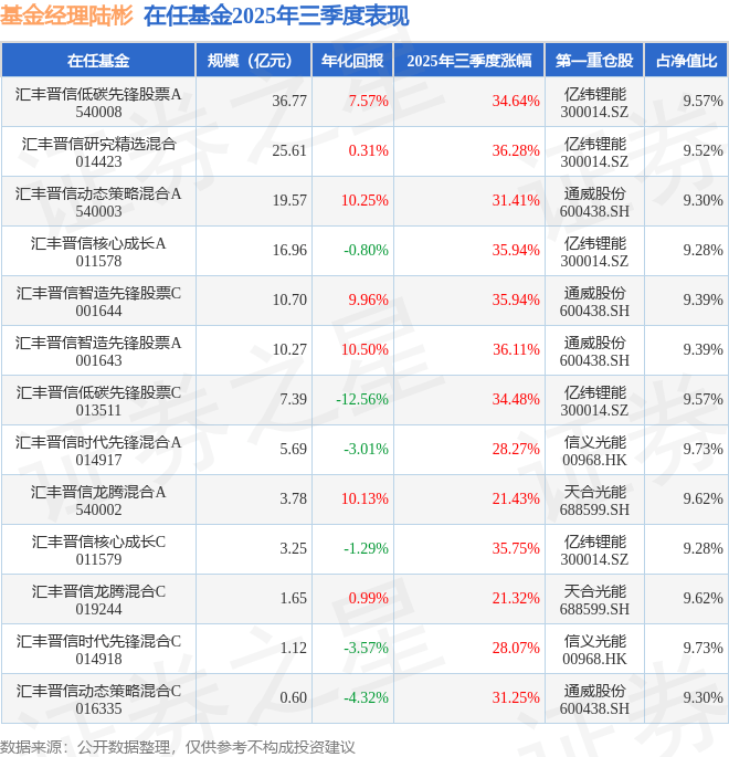陆彬管理的汇丰晋信智造先锋股票A基金在20年2季度买入当升科技,在持有2个季度后在20年4季度卖出。持有期间的估算收益率为96.24%,持有期间当升科技在2019年到2020年的年报归属净利润增幅达284.12%。