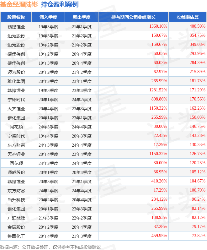 陆彬管理的汇丰晋信智造先锋股票A基金在19年3季度买入赣锋锂业,在持有1年又2个季度后在21年1季度卖出。持有期间的估算收益率为400.59%,持有期间赣锋锂业在2019年到2021年的年报归属净利润增幅达1360.16%。