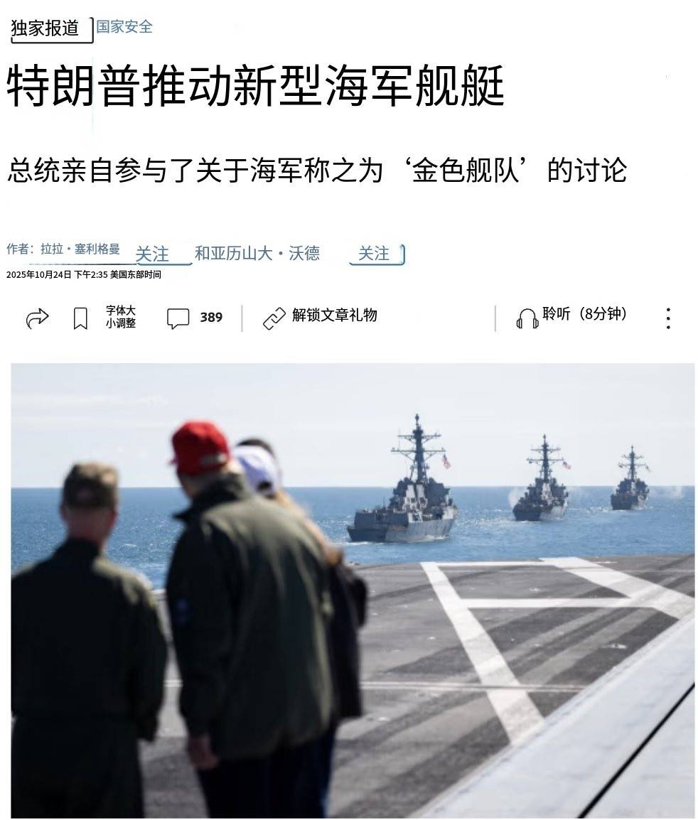 特朗普正在推动组建一支新的美国海军“黄金舰队”以对抗中国海军!当地时间2025年10月24日,美国媒体“华尔街日报”的报道称,美国海军,美国特朗普政府高级官员们,正在讨论,组建一支名为“黄金舰队”的海军力量,因为中国海军正在全力打造现代化战舰,美国海军的“黄金舰队”的舰艇将配备强大的远程导弹,据称美国五角大楼和美国白宫正在讨论,建造一艘排水量15000-20000吨的大型战舰(不知道是否为特朗普提出的,所谓恢复战列舰),这型舰艇将配备强大的装甲,配备高超音速导弹。
