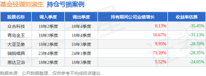 刘淑生管理的汇丰晋信2026周期混合基金在18年4季度买入益生股份,在持有2个季度后在19年2季度卖出。持有期间的估算收益率为142.39%,持有期间益生股份在2018年到2019年的年报归属净利润增幅达499.73%。