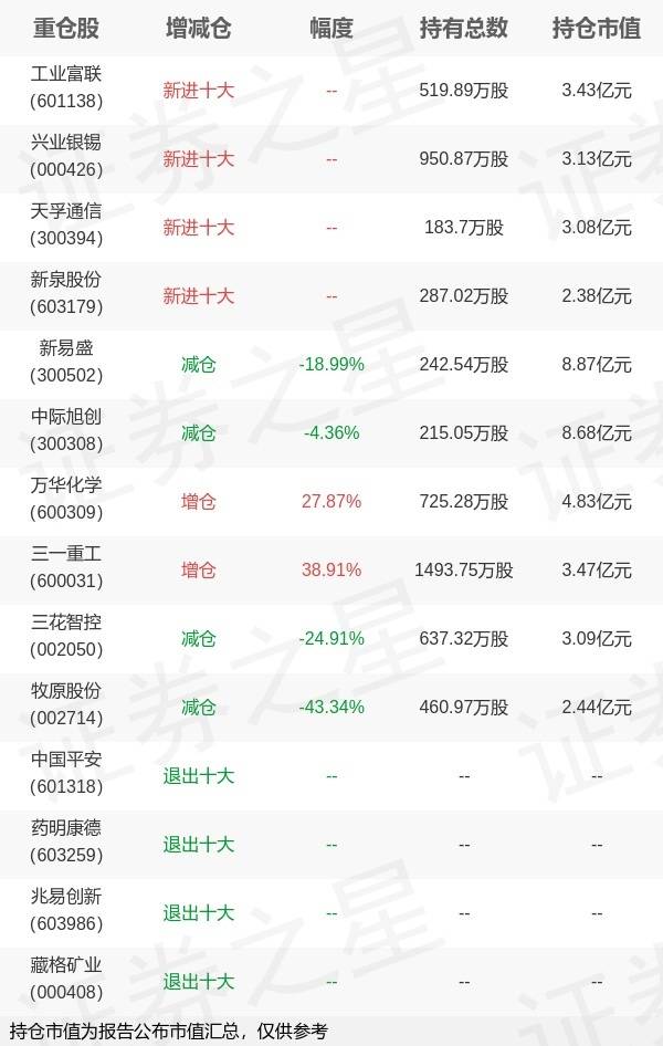 证券之星消息,10月28日中欧基金旗下周蔚文 冯炉丹管理的中欧新蓝筹灵活配置混合型基金公布三季报,近1年净值增长率62.34%。与上一季度相比,该基金前十大重仓股新增工业富联,兴业银锡,天孚通信,新泉股份;其中新易盛持仓占比9.52%,为该基金第一大重仓股;中国平安,药明康德,兆易创新,藏格矿业等退出前十大重仓股;详细数据如下: