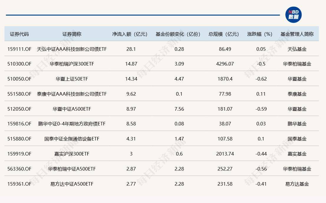 Wind数据显示,在10月28日非货币ETF市场中,天弘中证AAA科技创新公司债ETF基金份额增加0.28亿份,净流入额为28.10亿元;华泰柏瑞沪深300ETF基金份额增加3.09亿份,净流入额为14.87亿元;华夏上证50ETF基金份额增加4.47亿份,净流入额为14.34亿元。