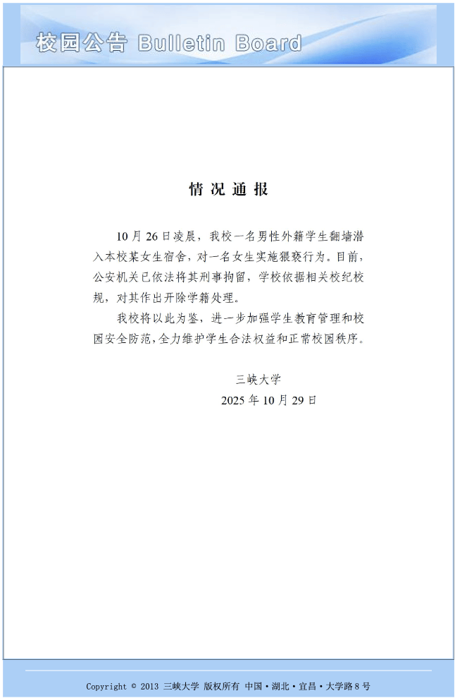 10月29日,三峡大学发布情况通报:10月26日凌晨,我校一名男性外籍学生翻墙潜入本校某女生宿舍,对一名女生实施猥亵行为。目前,公安机关已依法将其刑事拘留,学校依据相关校纪校规,对其作出开除学籍处理。