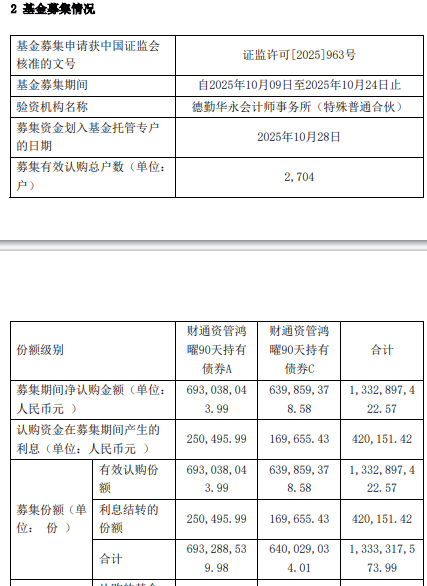 募集期间净认购金额1,332,897,422.57元,认购资金在募集期间产生的利息420,151.42元,募集份额合计1,333,317,573.99份。
