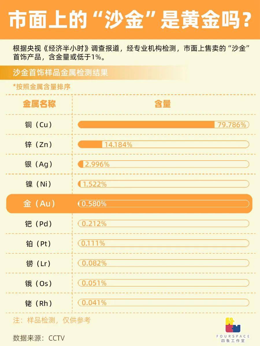 此外,调查还发现,市面上部分 “沙金” 首饰甚至连表面的镀金层都没有,直接采用铜合金本色(通过化学处理使其呈现金色),这类产品在佩戴一段时间后(通常 1-2 个月)会出现褪色、生锈等问题。